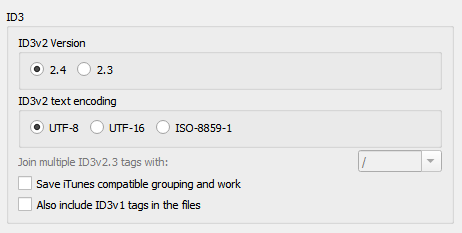 As mentioned above, ID3v2.3 does not support multi-value tags, and so Picard flattens these to strings before saving them to ID3v2.3 tags. This setting defines the string used to separate the values when flattened. Use ‘; ‘ for the greatest compatibility (rather than ‘/’ since tags more often contain a ‘/’ than a ‘;’) and for the best visual compatibility in Picard between ID3v2.3 and other tagging formats.