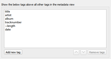Les balises spécifiées dans ce paramètre d’option seront toujours affichées dans l’ordre spécifié en haut du volet des métadonnées (qui affiche les métadonnées des fichiers ou pistes sélectionnés). Cela vous permet d’avoir les balises les plus importantes toujours en haut de la liste. Les balises non répertoriées ici seront affichées par ordre alphabétique sous les balises supérieures.